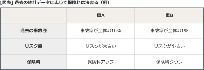 先ほどの表で挙げられた要素に対して、実際に事故を起こすリスクがどのくらいかを、保険会社は過去の統計から判断します。それにしたがって料率が算出され、保険料が決定します。