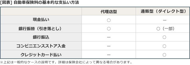 自動車保険の保険料の支払い方法は、契約している自動車保険が代理店型か通販型(ダイレクト型)かで異なることが多いようです。どのような支払い方法があるのか確認しておきましょう。