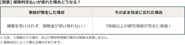 なお、そのまま保険料を支払わなかった場合はどうなるのでしょうか。未入金のままの場合、補償を受けられないほか、7等級以上の割引等級の場合は、せっかくの等級が消滅してしまうことがあります(5等級以下は13カ月間消滅しません)。この点でも注意が必要になります。